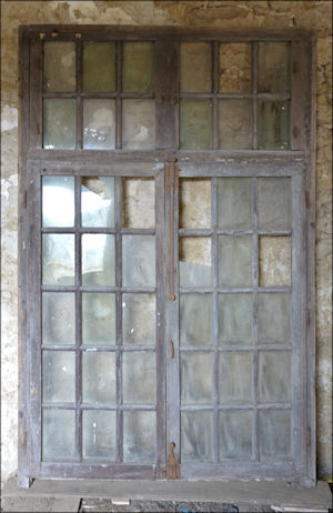 Cette étude est la troisième et la dernière consacrée aux croisées du Rocher-Portail. Il s’agit ici d’une croisée de fabrication simple à petits carreaux et à imposte fixe qui peut être datée du début du XVIIIe siècle. Elle diffère donc largement des deux premières étudiées qui étaient de véritables croisées à trois compartiments, à simples volets de bois et à vitreries mises en plomb. Elle est aujourd’hui déposée et entreposée dans la galerie.